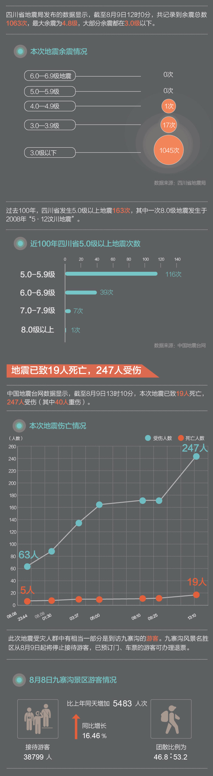截至8月9日13时10分,经初步核查,“8·8”九寨沟地震已致19人死亡,247人受伤(其中40人重伤)。