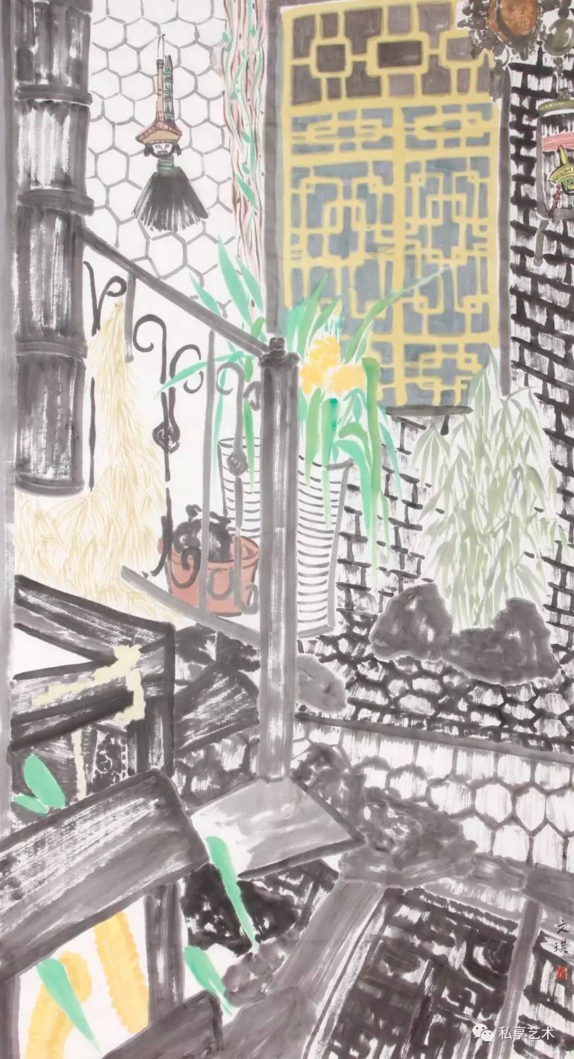 每一位大师都要有属于自己独特的的绘画修养和绘画语言,而每一幅优秀的艺术作品不仅仅要富有着深刻的内涵,更多要体现的还是画家自身的艺术修养。在《新庭院》系列作品中的创作灵感,来源于作者与城市现代仿古庭院所产生的情感共鸣以及古诗词。且在《新庭院》系列作品的创作过程之中,笔者透过以亲切、平实的构图基调,促成观赏者与图景的融合,创造了一个宽容、平和、恬静的母性环境,消除了观赏者的心理距离。而《新庭院》系列作品中对于“线”的应用、墨色层次的处理、治愈系色彩的表达等创作技巧,更加足以落实到画面的闲适生活追求和写生与创作的紧密关系。于是笔者在《新庭院》系列作品创作投入的这样一种过程之中逻辑性极强;在一系列充分的前期、中期、后期准备工作磨合创作过程之中,一步步地寻找到了适合适宜自己表达的绘画语言,以及绘画抒写内容与专有专属性的独特形式感,并且能够以此体现自身内心的丰富情感及其对中华传统文化艺术的理念和追求。