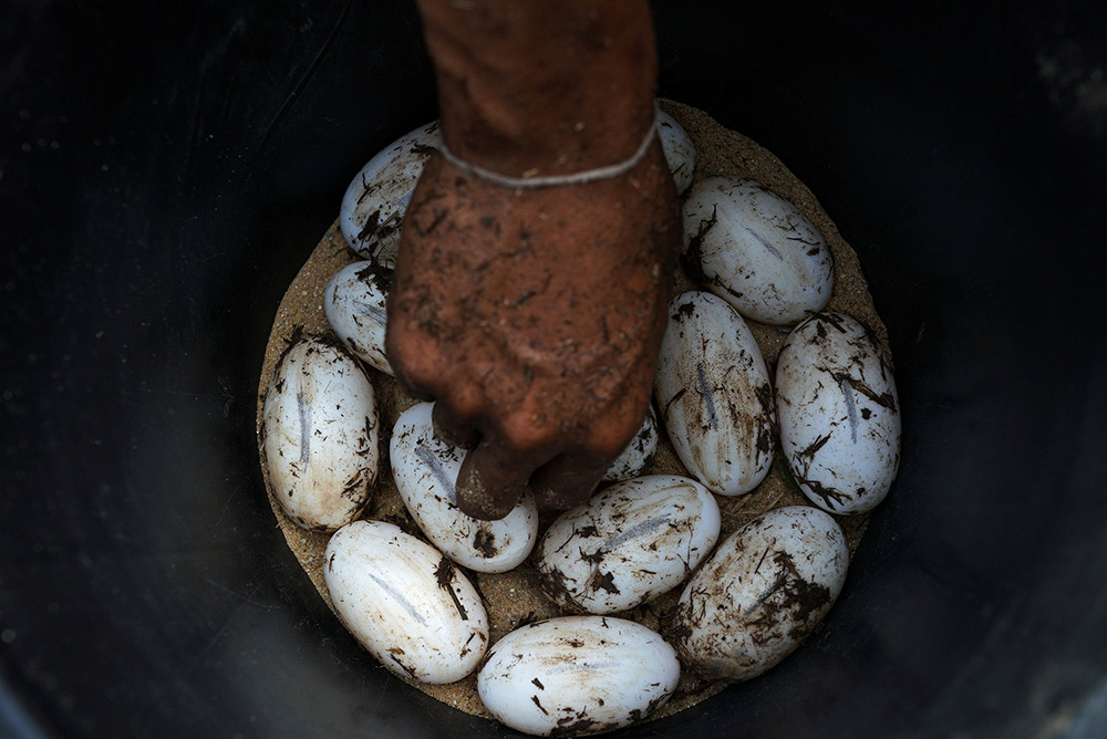当地时间2017年5月24日,泰国阿育他亚府,一名工人在收集鳄鱼蛋。