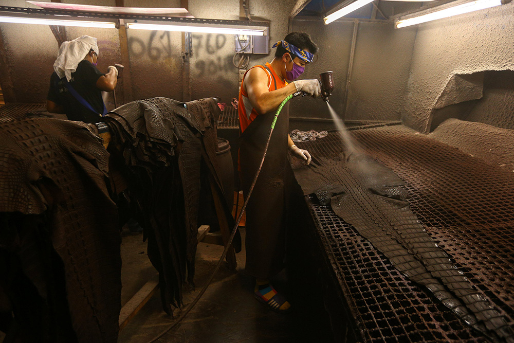 当地时间2017年5月24日,泰国北榄省,一家鳄鱼皮制革厂里工人在为鳄鱼皮喷色。