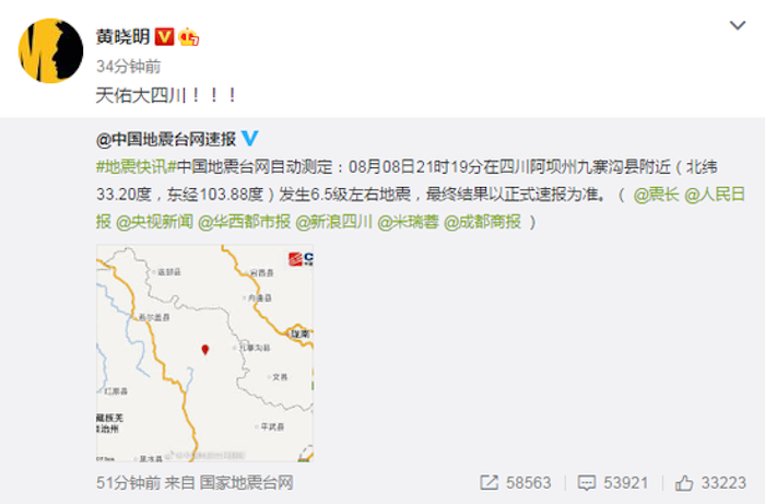 8月8日21时19分,四川阿坝州九寨沟县附近发生7.0级地震。黄晓明在微博上为灾区祈福“天佑大四川”,并于8月8日晚通过明天爱心基金为九寨沟灾区捐出50万元善款,用于救灾及灾后重建,同时通过基金会连夜向灾区发放物资。