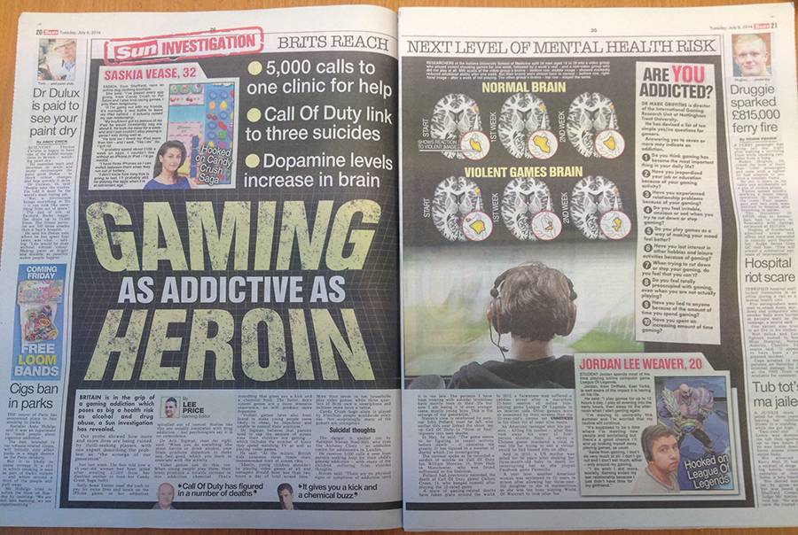 ▲ 2014年7月,英国《太阳报》整版刊出“游戏成瘾堪比海洛因”。随后游戏网站Eurogamer的新闻编辑Wesley Yin-Poole撰文称,“无论对大人还是小孩来说,问题在于他们对时间的管理……” eurogamer.net