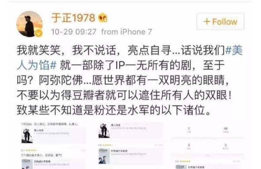 这和去年手撕正午阳光豆瓣评分的于正情况类似。2016年10月,改编自网络作家丁墨作品的两部剧同时上线。一部是于正操刀的网剧《美人为馅》,一部是正午阳光的电视剧《如果蜗牛有爱情》。两部剧的口碑和关注度差距较大,当时于正就在微博直指正午阳光水军在豆瓣故意给《美人为馅》打低分。