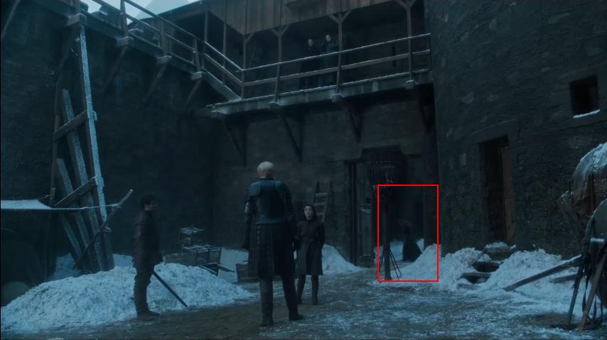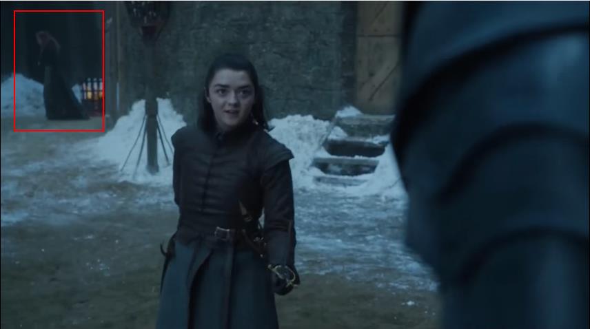 现在,这个场景又因为别的原因吸引了观众的注意力。有一位粉丝认为背景里出现了猫姨凯特琳·史塔克(米歇尔·菲尔利 饰)的幽灵。就在二丫提醒美人,承诺向猫姨的两个女儿效力的时候。