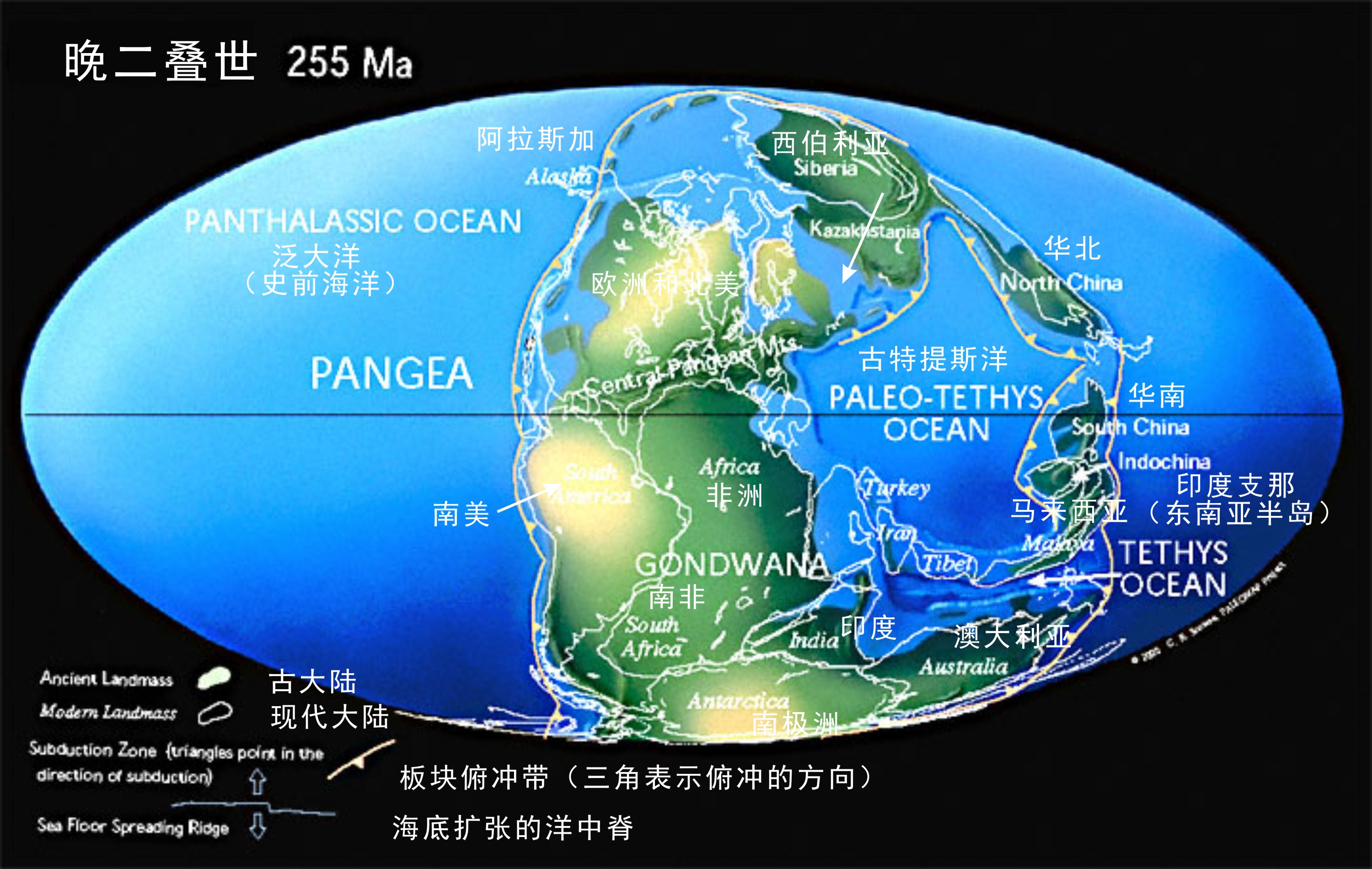 250Ma左右形成的联合古陆是距离我们最近的一次,空间分布上,联合古陆呈典型的经向半球形分布,今天我们所看到的海陆分布格局就是在此基础上裂解、漂移形成的。