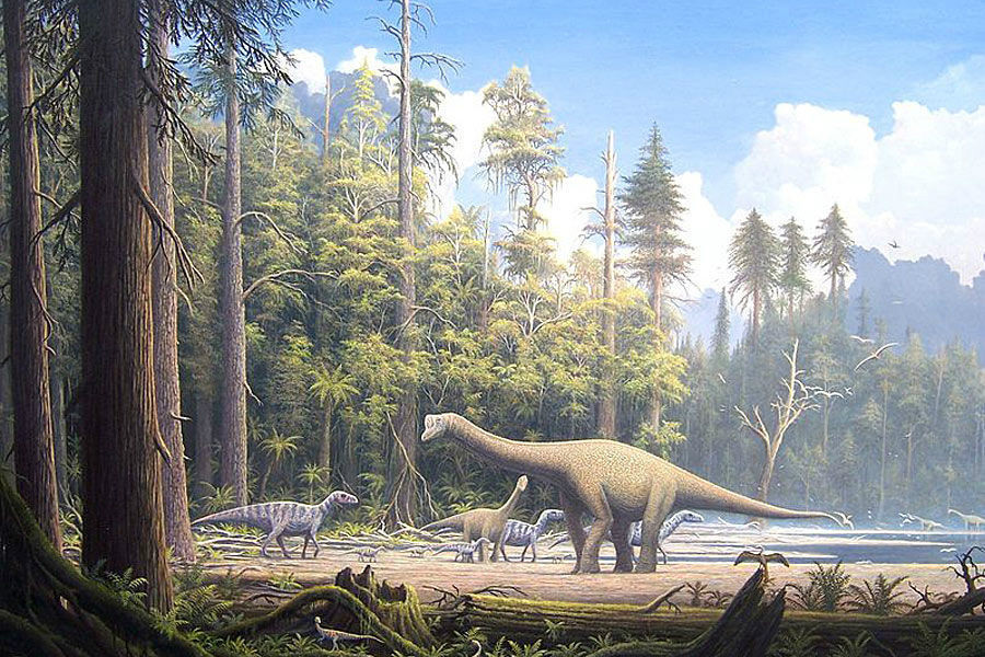 (4)第四次大灭绝事件:2.0亿年前,除鱼龙外所有的海生爬行动物灭绝,一半海洋物种消失。陆地所有迷龙和大多数合弓类动物消失。槽齿目动物灭绝了,幸存的植物有针叶类和苏铁。也正是这次灭绝事件,给恐龙提供了广阔的生存空间,使得恐龙成为接下来一段时间地球的霸主。