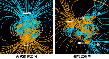 上图(引自NASA)为超级计算机中的地球磁场模型,左侧为通常所见具有两个磁极的地磁场,这是两次倒转之间漫长年代的典型形态;右侧为短时间(相对而言)内处于磁极倒转过程中地磁场发生了剧烈变化的复杂形态。
