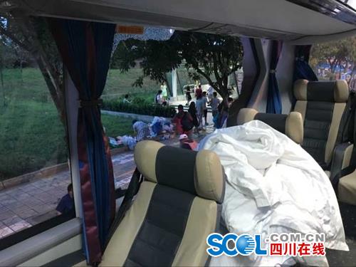 夜幕将至,这是九寨旅游团队返回成都动物园集散地的第16辆大巴。这辆大巴的后车窗被落石砸中,整块玻璃碎成一地,当时坐在这个窗边的是一对来自浙江的小情侣,女孩名叫曾雅静,是位老师,她和男朋友黄伟(化名)趁暑假来九寨沟玩。刚到九寨沟的第一天就发生了地震。“地震发生后,我们坐大巴往酒店赶,突然间有块飞石砸进了后车窗,我就感觉突然被他抱住了,睁开眼睛才发现玻璃在脚下碎了一地,脚边还有块四个拳头那么大的石头。”曾雅静激动的对记者说。当时车上一共29人,后车窗被碎石砸破后,导游和司机让大家到大巴的另一侧躲避,并用棉被塞住破损的玻璃,避免碎玻璃伤人。8月9日晚20点30分,全车人都安全回到成都。