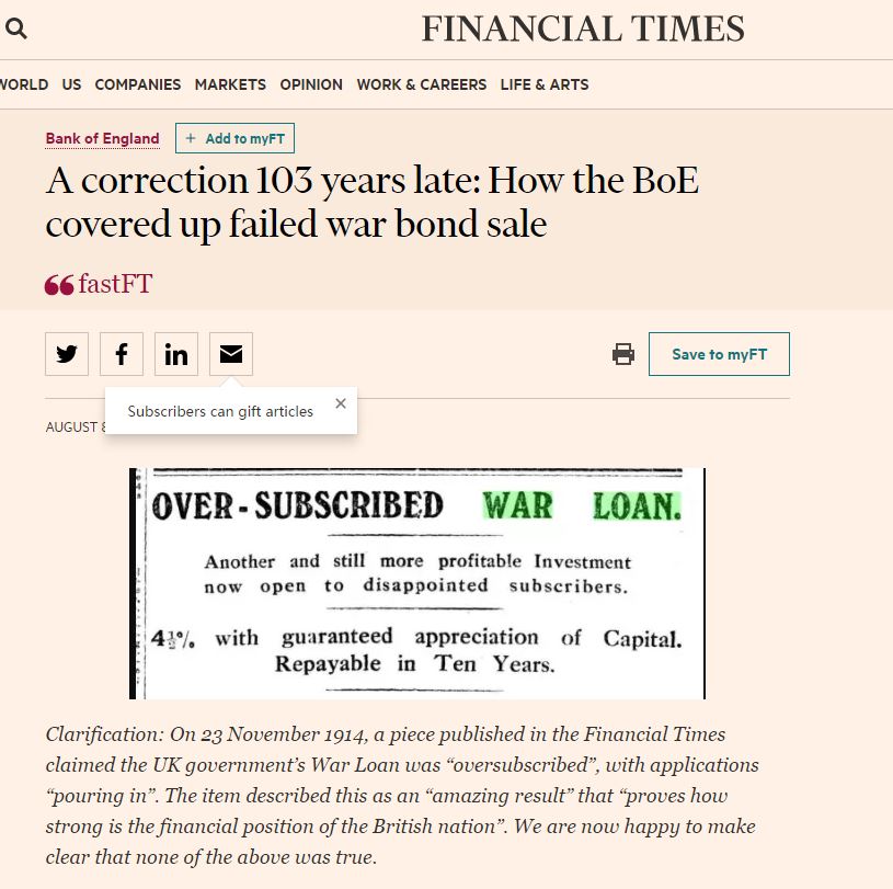 当日,英国《金融时报》刊文,对一篇103年前的报道进行勘误,承认当时对“战争债券”获得超额认购的描述有误: