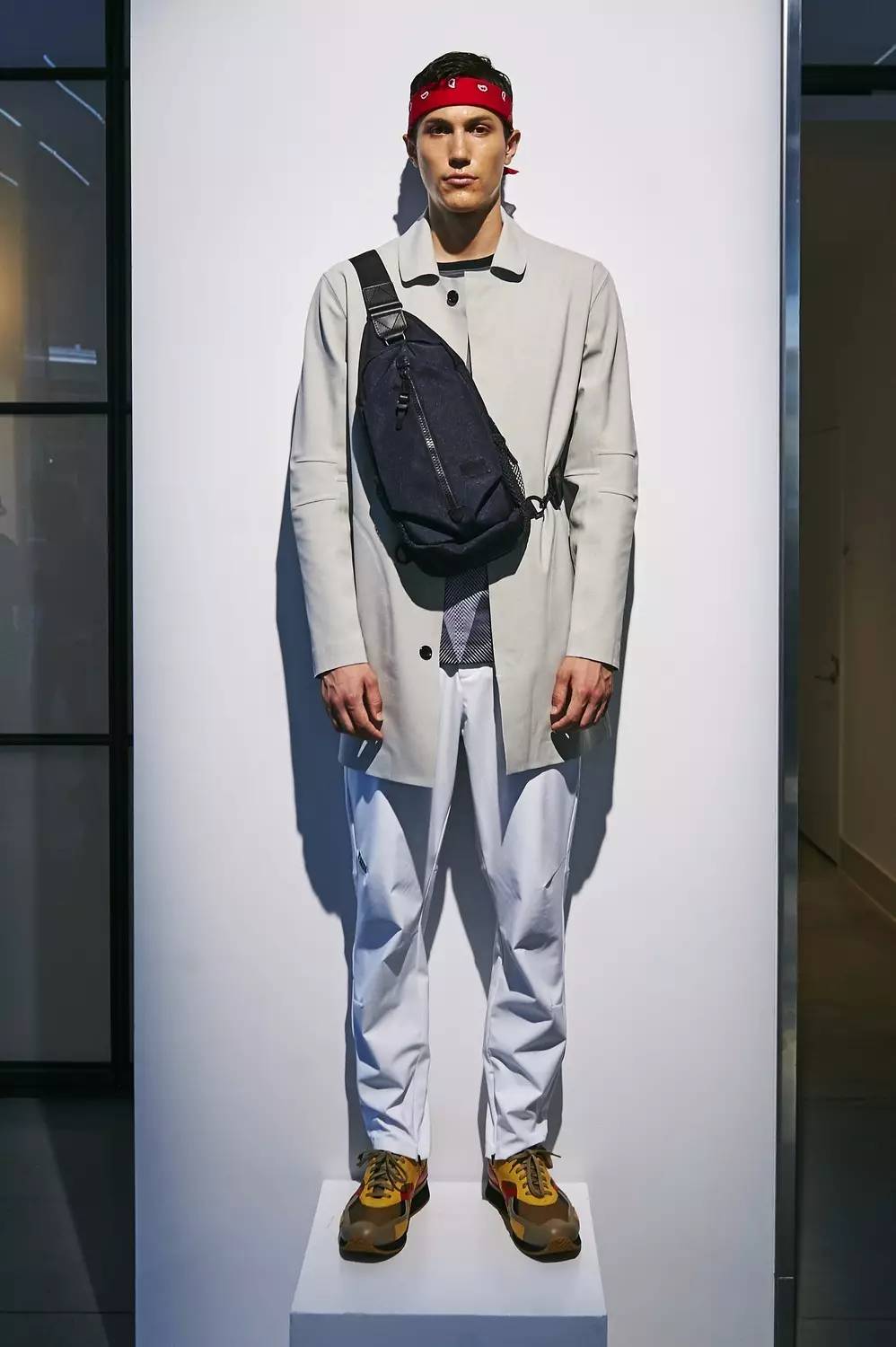 在这个系列中,一些看上去很日常的服装:牛仔衬衫,渐变色T恤,Joggers(慢跑裤)……经过一些奇思妙想的改造就成了吸睛满点的时尚运动装。其实这些都是用高科技特殊材料制成,防水,透气,舒适,阻隔气味等等都是由材料带来的功能。在运动基本款的基础上打造出新意,进行轮廓剪裁、颜色拼接,是设计师Christopher Bevans的绝活。
