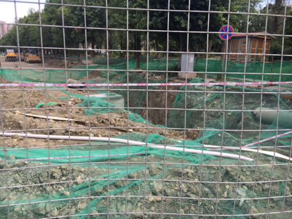 在道路施工的围挡外,可以看见这里只有为数不多的工人,以及几辆未运行的挖掘机,几乎是没有施工的动静。