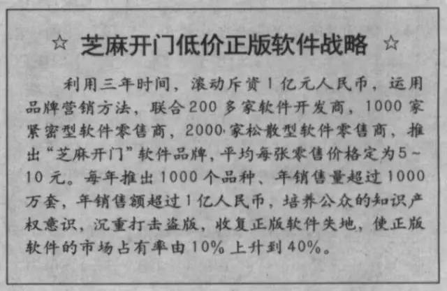 2003年元旦过后,中央电视台的广告中出现了一条少见的软件品牌广告,广告词是:“芝麻开门,10元正版软件”。