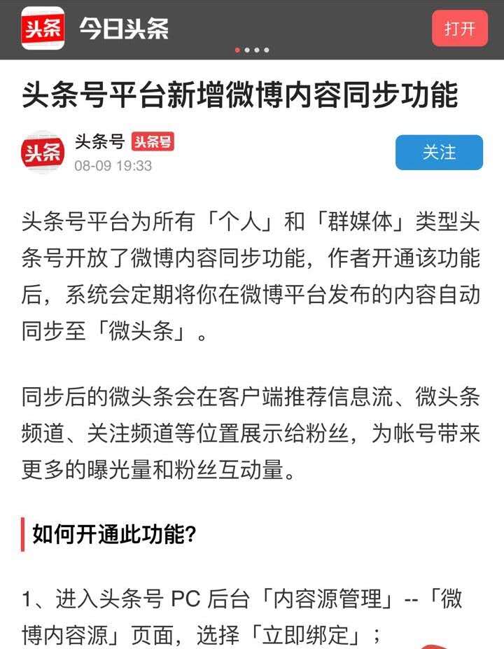 头条号称,“平台为所有个人和群媒体类型头条号开放了微博内容同步功能,作者开通该功能后,系统会定期将你在微博平台发布的内容自动同步至微头条。同步后的微头条会在客户端推荐信息流、微头条频道、关注频道等位置展示给粉丝,为账号带来更多的曝光量和粉丝互动量。”