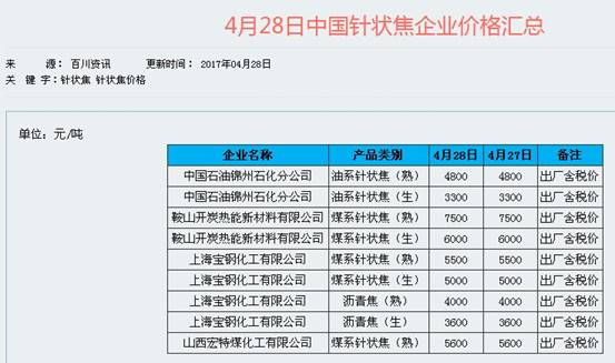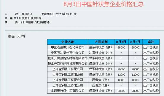 以8月3日百川资讯的汇总来看,油系针状焦(熟)出厂含税价要到2.8万元/吨(中国石油锦州石化分公司),煤系针状焦(熟)的价格最高同样可达2.8万元/吨(山西宏特煤化工有限公司),低一点的如上海宝钢化工有限公司的报价也有2万元/吨,上海宝钢化工有限公司的煤系针状焦(生)报价为1.2万元/吨。