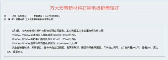 界面新闻记者在百川资讯中看到,截至8月3日统计,普通功率石墨电极Φ600mm规格的出厂含税价最高已然到9万元/吨,高功率石墨电极Φ600mm规格的石墨电极最高到13万元/吨,超高功率石墨电极同样规格的产品报价最高为16万吨。就在8月3日,方大炭素持股52.11%的合肥炭素生产高功率石墨电极价格刚刚做了上调。百川资讯点评为该企业销售较好,库存低位,出口订单较多。超高功率石墨电极销售较好,库存低位,产能2万吨,6月产量1500吨左右,普通、高功率、超高功率产品各占1/3。