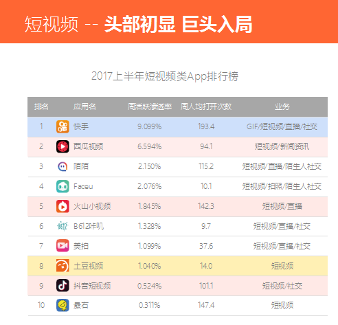 2017年短视频的热度持续不减,占据更多的市场份额成为头部玩家的当务之急,巨头纷纷入局:腾讯狂砸3.5亿美金入股快手,阿里将土豆全面转型为短视频平台,而今日头条以三款App分化短视频市场,与阿里同时选择斥巨资扶持短视频创作者。