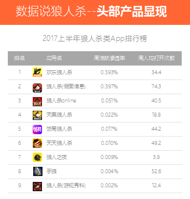 今年初,借着综艺、直播的推动,老桌游狼人杀从线下杀到线上,在手游端爆发。猎豹全球智库的狼人杀app榜单中,头部产品“欢乐狼人杀”的周活跃渗透率甚至超过了斗鱼。