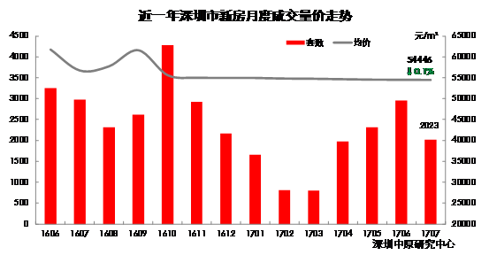 深圳中原研究中心数据显示,7月新房住宅批售43.1万平方米,推售23.2万平方米,环比分别增多102%和17%,市场整体供应为2017年以来的最高峰。但是深圳新房成交均价为54446元/平方米,处于平稳位置,成交量却只有2023套,环比下跌31.5%。