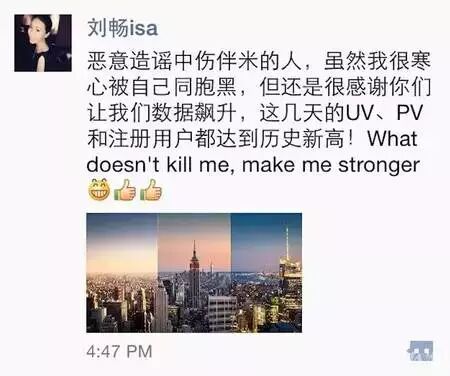 在伴米还没有走出这次公关危机时,刘畅在朋友圈发言“What doesn’t kill me makes me stronger”。在之后,伴米网很少出现在媒体视线中。