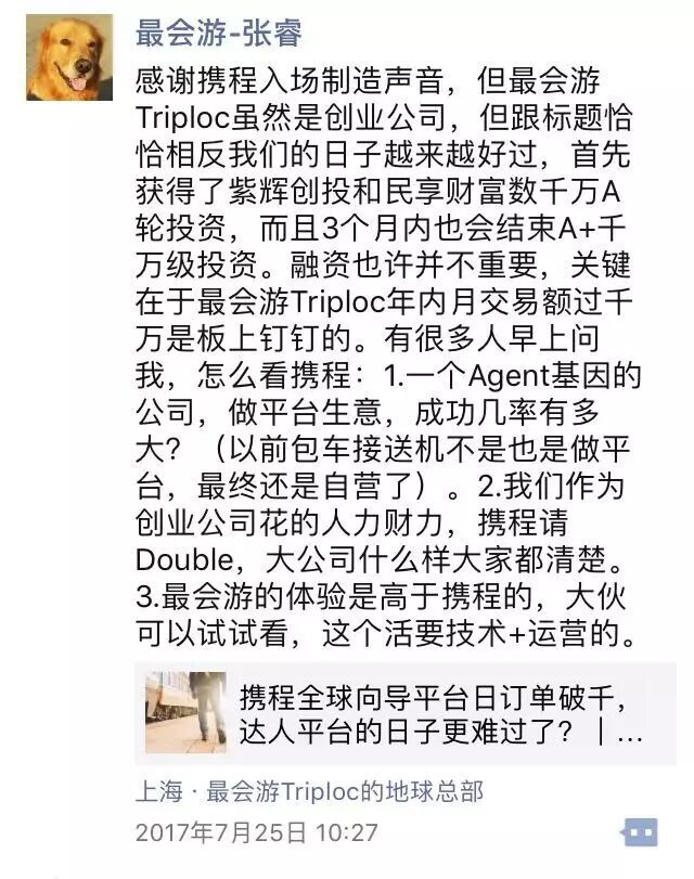 在环球旅讯发布了《携程全球向导平台日订单量破千 达人平台的日子更难过了?》一文之后,最会游CEO张睿在朋友圈评论道:
