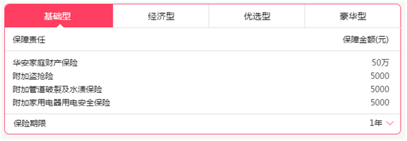 满堂福家财险有四种类型,分别为基础型、经济型、优选型和豪华型,对应不同的保额。基础型保费227.5元,家财险保额50万元,如下: