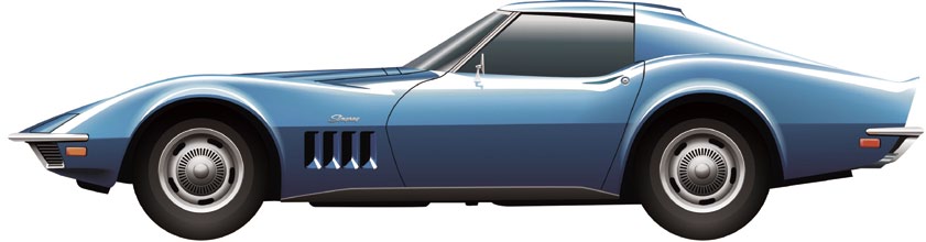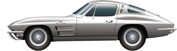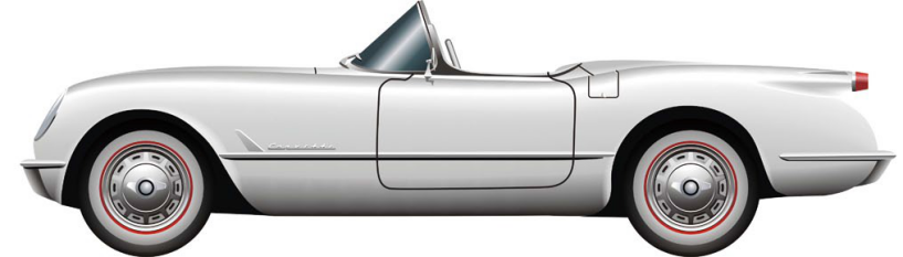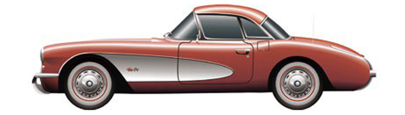 1953年产的克尔维特跑车仅有300辆,采用了白色外观与红色内饰的敞篷设计,它拥有更加轻盈的玻璃纤维材质车身,但其动力性能却相对薄弱,只配备了一个最大功率为110千瓦的6缸发动机和一个自动变速箱。C1的生产周期长达九年,后期融入了许多新的设计元素。左图为由C1原型车演进而来的Coupe型号。