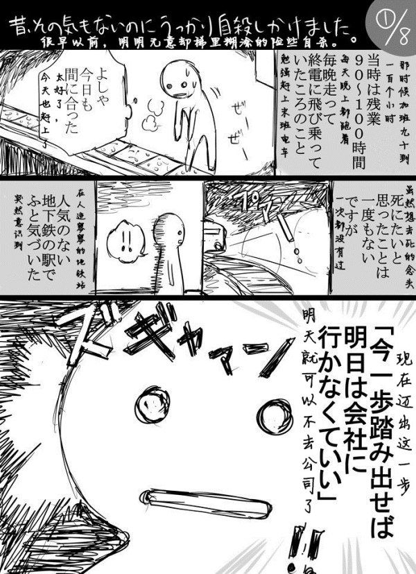 2015年去世的电通公司员工高桥茉莉就没有那么幸运了。时年24岁的高桥茉莉,从东京大学毕业后,进了一家让所有人都很羡慕的知名广告制作公司。“死”字,从没有出现在她的字典里。开始工作的6个月之后,她每晚都坐最后一班电车回家。一个月多达130小时的加班重负,让她“看不见”、”听不见”、甚至感受不到疲惫。直到一天,回家的那一趟电车向她慢慢驶来,她突然想到“再往前一步,跳下去,明天就不用上班了”,真地往前伸出脚,走了一步,掉了进去。这个画面来自漫画家汐街kona的漫画。她看完了高桥茉莉的新闻,有感而发。漫画的名字叫做《到死才辞职》。