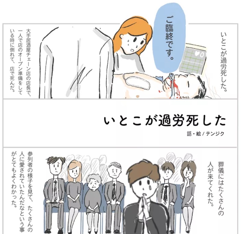 漫画是关于伸代有余在知名连锁居酒屋工作的堂兄的故事。作品引起了大反响,30万转发,11万点赞。在这之前,这场“很不起眼”的死亡并没能引起什么注意,甚至一个新闻报道的版面也没有上。