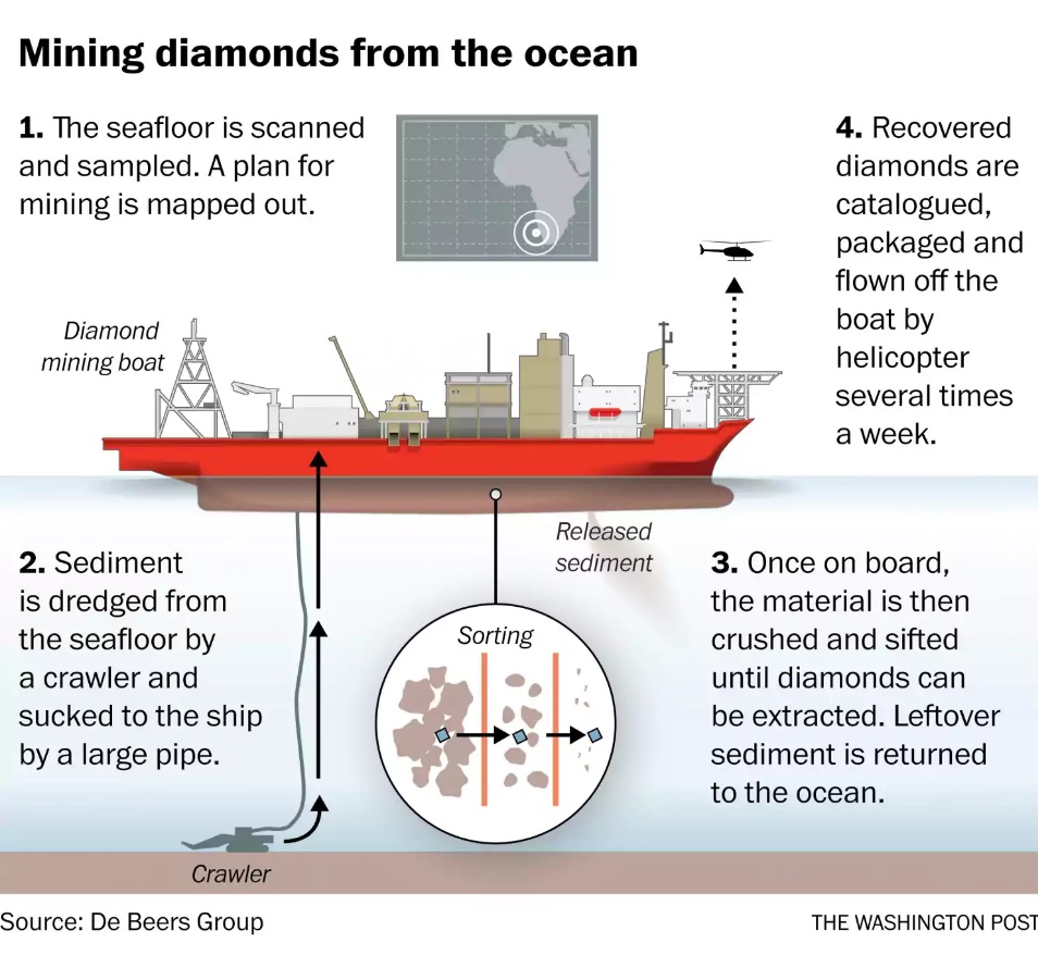 纳米比亚海上的钻石开采工作通常在约120-140米深的水下进行。目前,戴比尔斯公司已经在纳米比亚离海岸35000米、水深110米的海底开采钻石达数百万克拉。