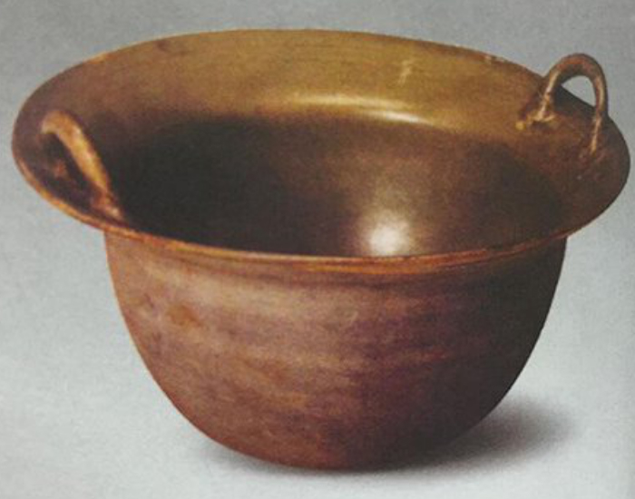 唐代的饮茶方式以“烹煮”为主,把茶饼碾末放入茶釜中煎煮,所以釜在当时是一种非常重要的茶具。下图的釜,敞口,深腹,口沿有两桥形耳,釉色莹润,器形规整,是典型的越窑青瓷茶具。