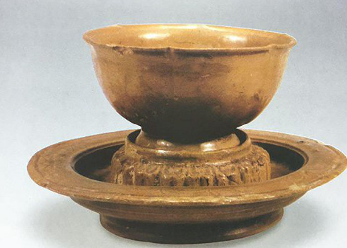 以琉璃制作茶具是一件很奢侈的事,起码在唐代这种材料制成的茶具只有皇室或者贵族等上层阶级才能享受,最具代表性的就是陕西扶风法门寺地宫出土的琉璃茶盏托。这套茶具由唐宗室供奉,表面呈淡黄色,造型简洁大方,素面不带任何纹饰,代表着唐代的琉璃生产水平,堪称珍贵之物。