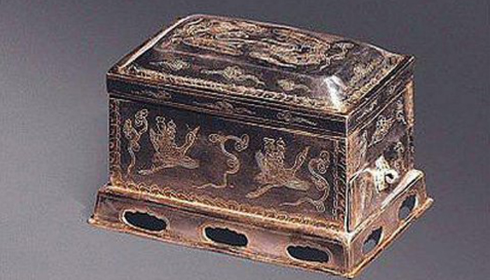 筛茶用的茶罗,内部有一层纱网,最下层则是承接茶末的抽屉,茶末筛罗好后直接将抽屉取出即可。罗盒外壁刻有仙鹤流云装饰,表达了饮茶登仙的思想。
