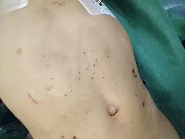 这名网友提供的图片显示,小女孩的头部疑似大面积烫伤,身上有不少伤痕,大腿上的淤青清晰可见,腹部也有许多细小的洞眼。“这可能是用针扎的。”爆料者称,“并且小女孩的会阴烂掉,头也开颅了”。
