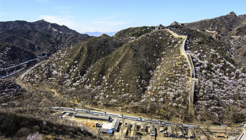 站在中铁五局八达岭隧道二号斜井工地的位置,可以清晰地看到对面山头八达岭长城的烽火台。工地门外,老京张铁路的一个小站静静地卧在山坡上,偶尔一列只有很少几节车厢的列车驶过,拉慢了时光。