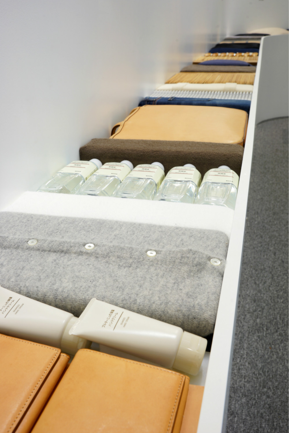 针对这场展览,无印良品将“触觉”放在了首位,被放大并强调,大友聪指出这是出于从多角度诠释商品的目的,从另一个角度看,同触觉直接相关的“材质”正是无印良品所关注的。很多织品类的素材都是无印良品自己在开发,比如和肌肤有直接接触的毛巾或披巾,而家具相关的材料,无印良品会选择一些有“背景”的材料,即其他公司不需要的废弃角料。