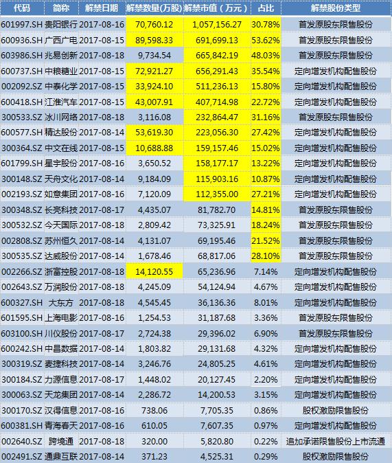 本周解禁股份超过1亿股的上市公司有8家,分别为广西广电(600936.SH)、中粮糖业(600737.SH)、贵阳银行、精达股份(600577.SH)、江淮汽车(600418.SH)、中泰化学(002092.SZ)、浙富控股(002266.SZ)和中文在线(300364.SZ)。