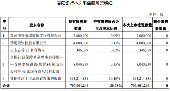 本月初江苏银行首发限售股解禁,涉及股东多达18119名,此次贵阳银行共涉及股东也有7629名。其中,包括贵州南音幕墙装饰工程有限公司、劲霸投资控股有限公司、王志玄等22名自然人、全国社会保障基金理事会以及其他本次上市流通首发限售股股东。因涉及股东数量众多,解禁后,贵阳银行将面临巨大解禁压力。