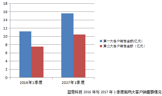 对比2017年和2016年的一季报,界面新闻发现,蓝思科技对前两大客户的销售额增长明显,同比增长比例均在39%左右。