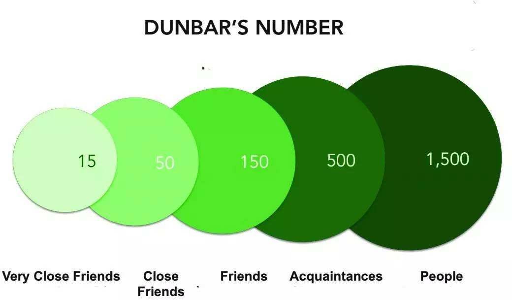 英国人类学家、牛津大学教授罗宾·邓巴曾研究过一个人能维系多大朋友圈的命题。他于1993年提出了“邓巴数字”,他在研究灵长类动物的大脑时,发现物种的大脑新皮质(大脑在进化过程中最后形成的部分)的平均大小与每一物种社交群体的大小具有相关性。他估计,将这一结论推导到人类身上,人们的社交圈人数应该在150人左右,其中包括了亲朋好友及经常碰面的熟人。具体来讲,5个死党、15个密友、150个朋友,这是一般人维持的社交关系。