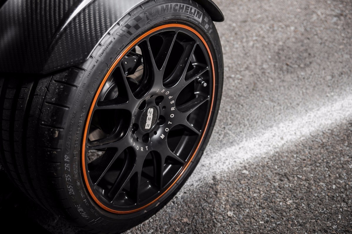 车轮方面,采用德国著名改装厂商BBS的低压锻造轮圈,与之匹配的轮胎为米其林PSS(规格:前215/40 R18、后255/35 R19),刹车卡钳则为Brembo。