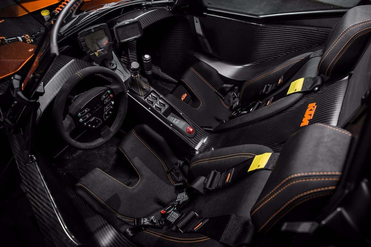 KTM X-BOW GT的内饰还是延续了赛车简洁实用的风格,并未有太多豪华的花哨装饰,在一片碳纤维的包裹中,专心驾驶是唯一能做的事情了。