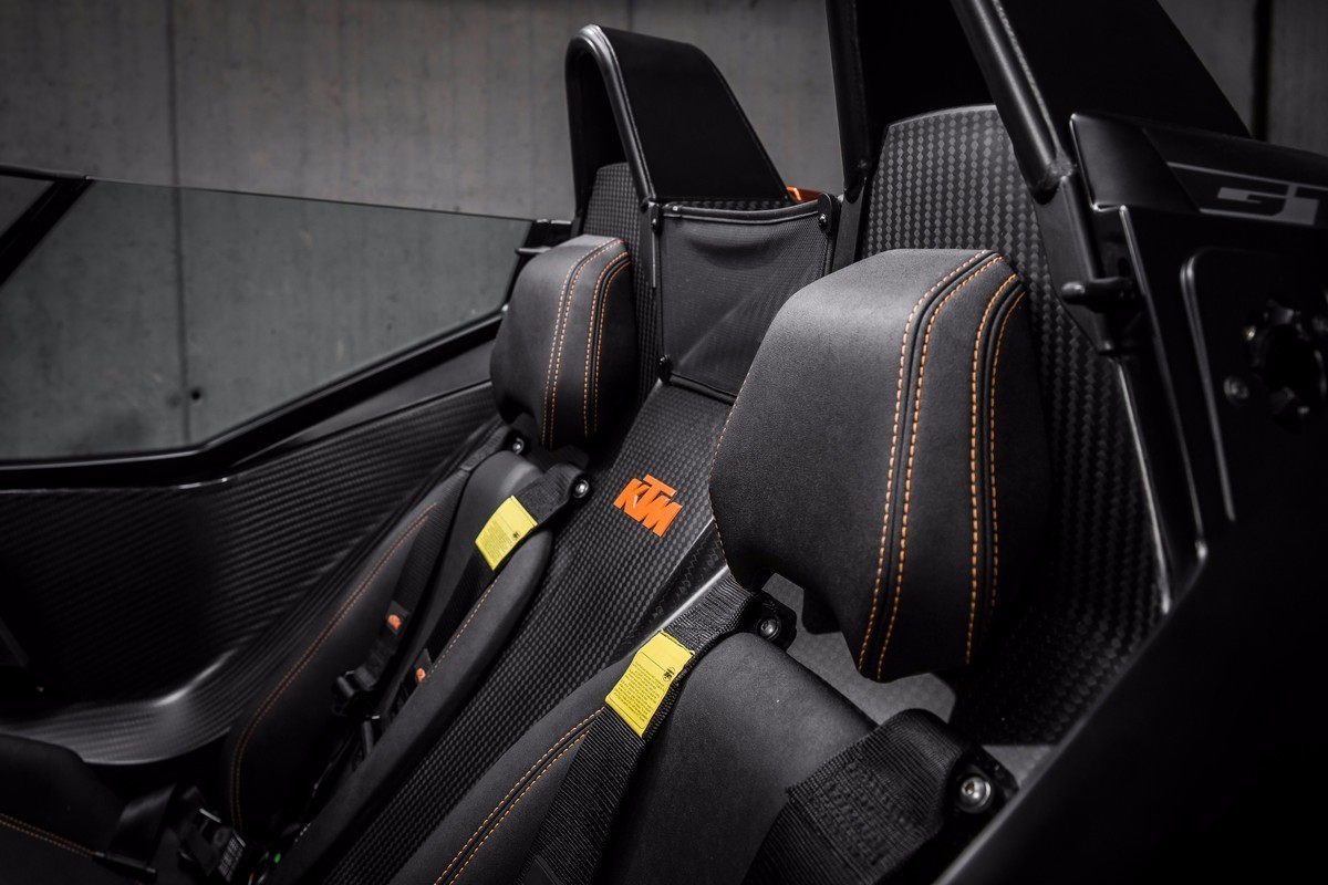 赛车座椅直接固定在一体式座舱内,只能通过调节踏板位置来适应驾驶者,而四点式的安全带则会把你牢牢捆在座椅上,因此KTM X-BOW GT并没有配备安全气囊。