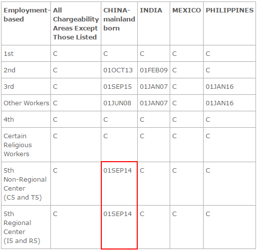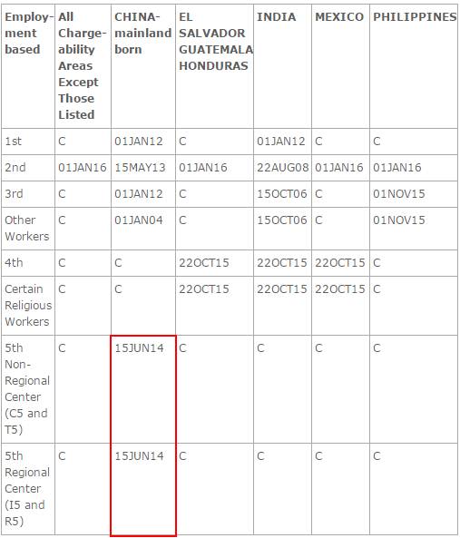 值得一提的是,针对中国籍普通本科及以上学历工作者的技术移民类别EB-2和EB-3排期日出现大幅倒退,优先日晚于EB-5类别!其中EB-5类别中的非技术性/专业性职位的“Other Workers”更是倒退至2008年6月,意味着此类在管道中申请绿卡的人需要等待9年才可以获得绿卡。
