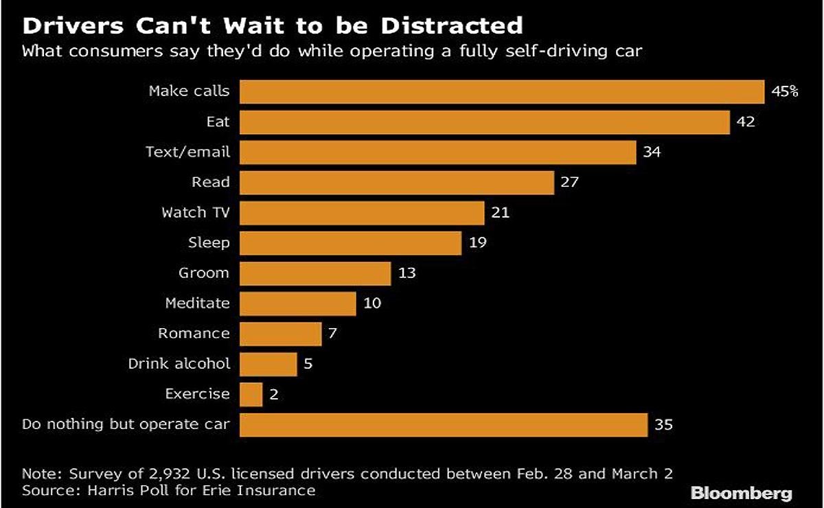 近日,彭博(Bloomberg)针对上述问题进行了一项调研。如果你驾驶一辆自动驾驶汽车,你准备在车里做些什么呢?结果显示,司机或者乘客们真是迫不及待地等待注意力被分散。