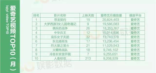 ★爱奇艺7月票房榜:《佣兵的战争》(588.5万) 、《寻龙契约》(500.7万)、《大梦西游3》(436.7万)