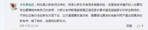 有老师@本桃要奋起 表示,“我是从新老师走过来的,大部分老师都能满足家长要求甚至超越家长和学生期待,否则也没有办法在新东方混下去,它只是需要改革体制,需要留住更多的老教师而不是去招更多的新老师。”