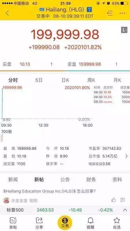 美国当地时间8月10日早间,纳斯达克上市的中概股“海亮教育集团”(Hailiang Education Group)在开盘后不久股价就从10.19美元/股,暴涨到了199999.99美元/股,成交700股,涨幅2020101.92%。