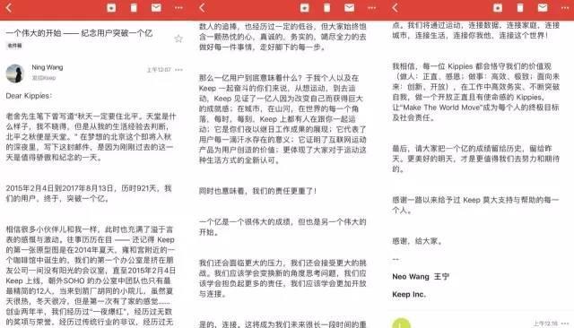 在Keep用户数破亿的当晚,王宁发布内部信,回顾Keep创业历程,并表示Keep未来的战略发展关键词为“连接”。“连接,将成为Keep未来很长一段时间的重点,将通过运动,连接数据、连接家庭、连接城市,连接生活,连接你我他,连接这个世界!”