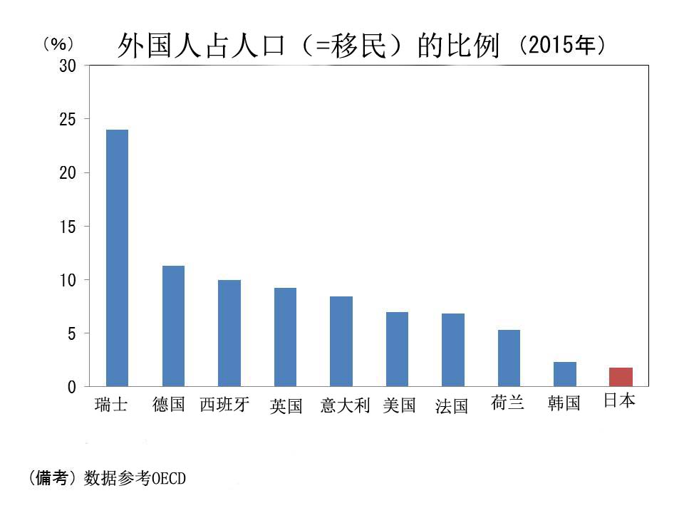 根据这种“外国人占人口比例 = 移民的比例”的计算方式,日本的移民比例只占总人数的2%。日本紧跟在韩国之后,在所有国家之中排名第十。瑞士排名第一,移民比例接近1/4,而德国、意大利、英国、法国等国家也都接近1/10。