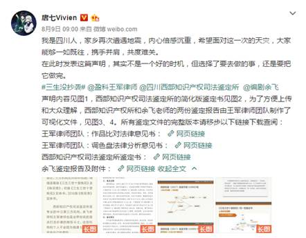 从小说到电视剧版,再到如今的电影版,一路走来,唐七始终背负着“抄袭”的骂名。而在8月9日这天,唐七终于选择为自己“发声”,并晒出了一份鉴定书,以求证明《三生三世十里桃花》无抄袭嫌疑。